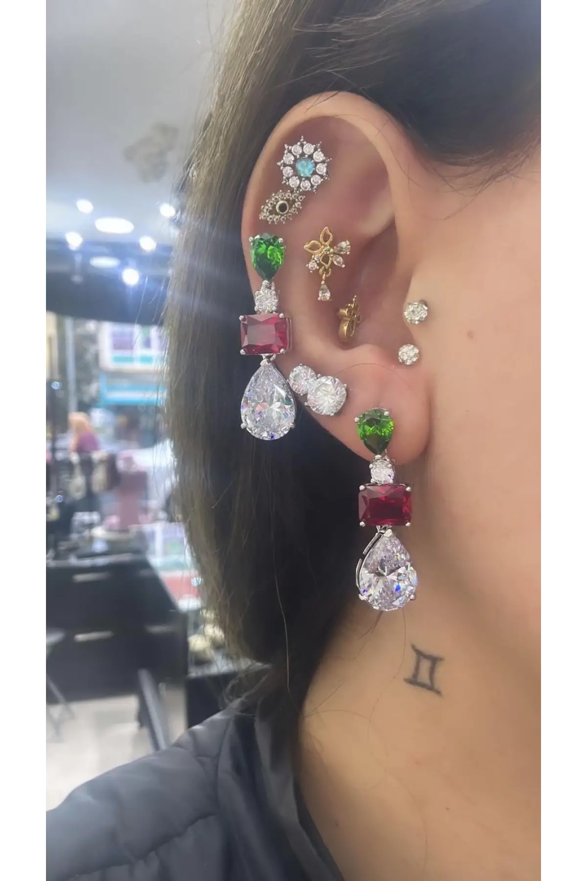 925 Ayar Gümüş Vip Renkli Taşlı Sallantılı Küpe