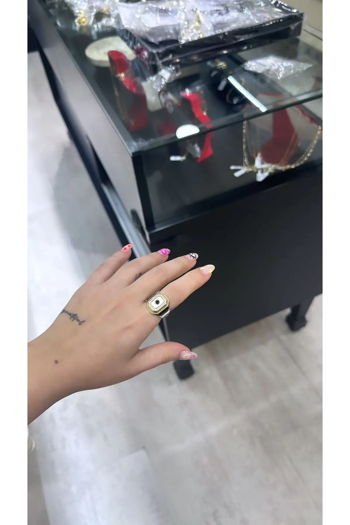 925 Ayar Gümüş Gold Siyah Beyaz Mineli Yüzük