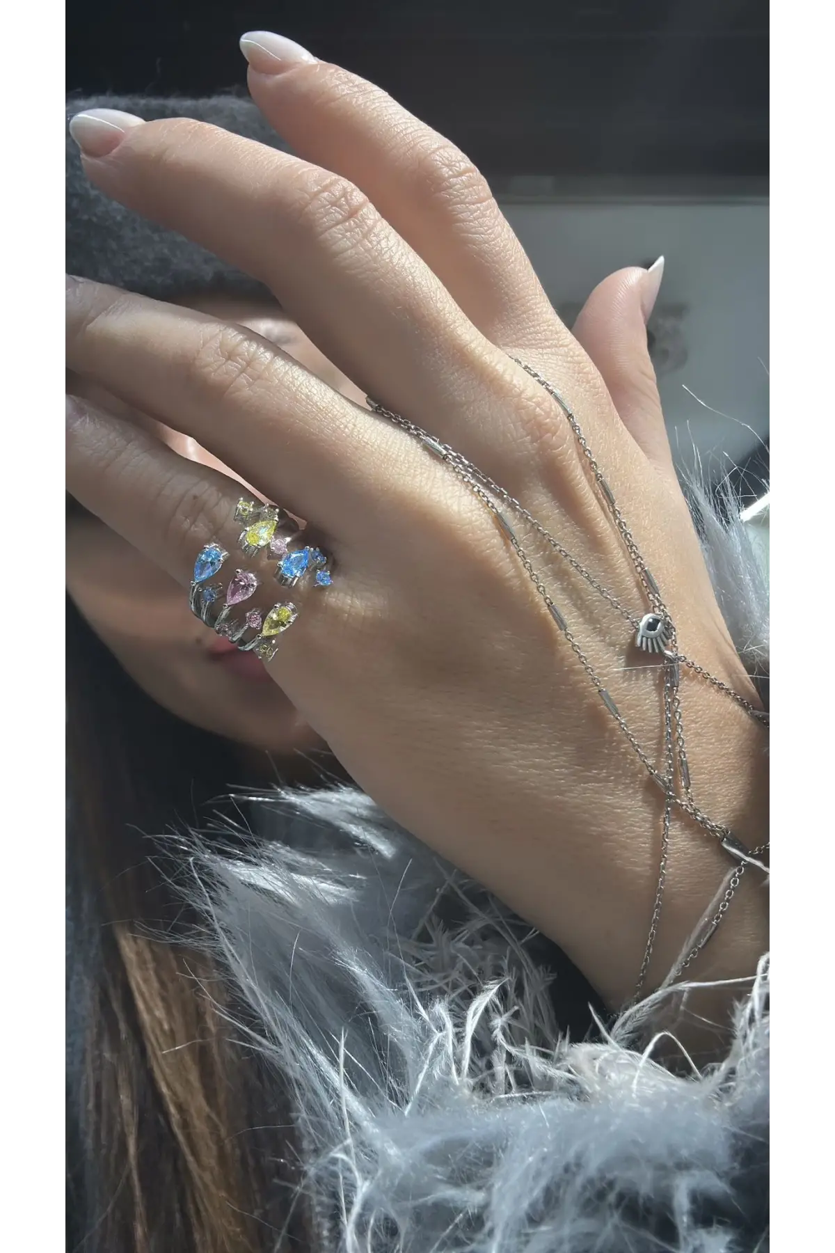 925 Ayar Gümüş Üzeri Renkli Taşlı Ayarlanabilir Yüzük