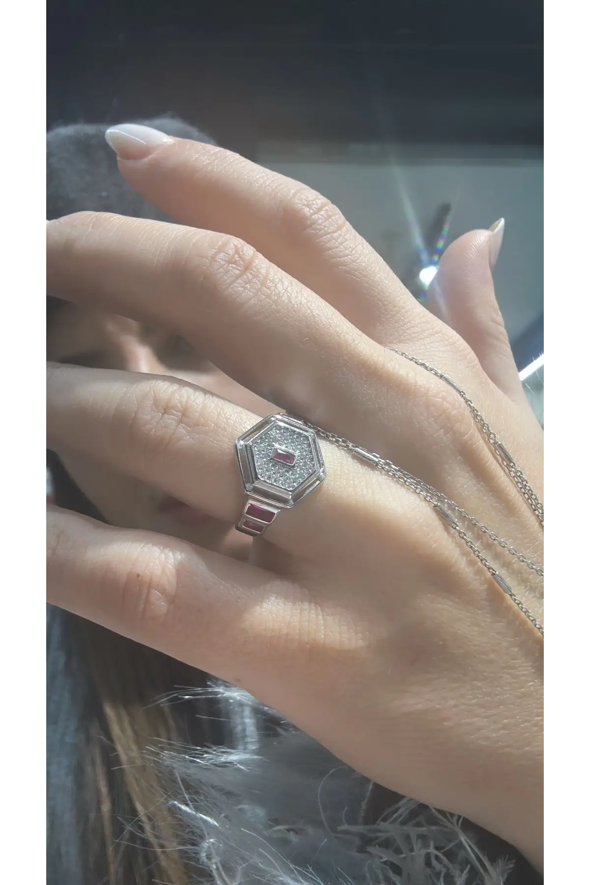 925 Ayar Gümüş Altıgen Taşlı Fuşya Yüzük